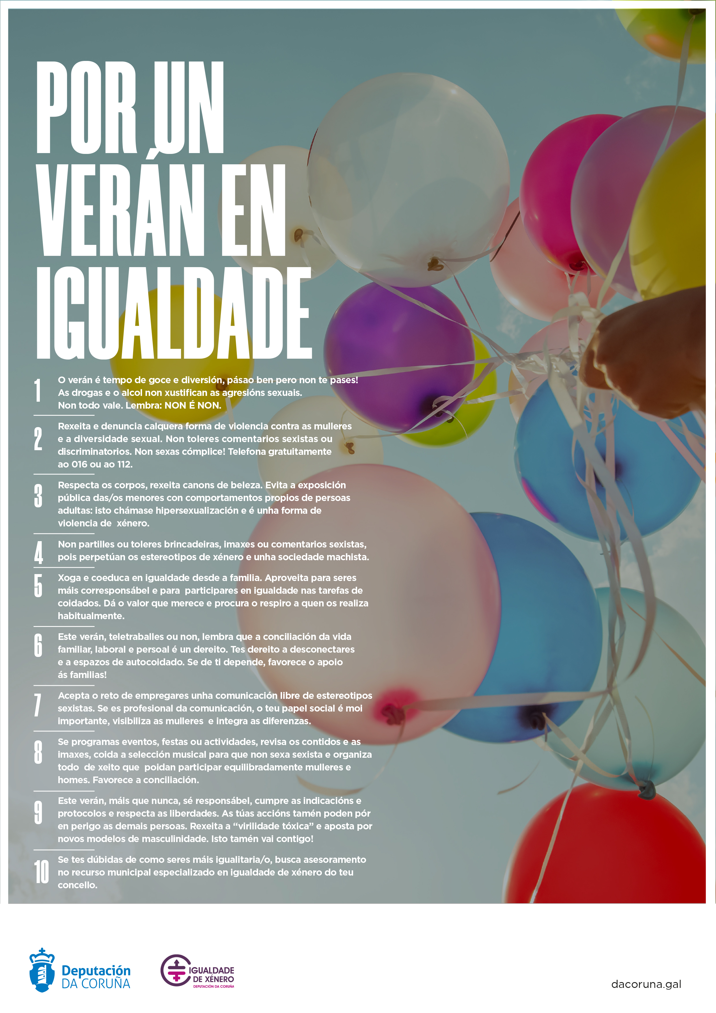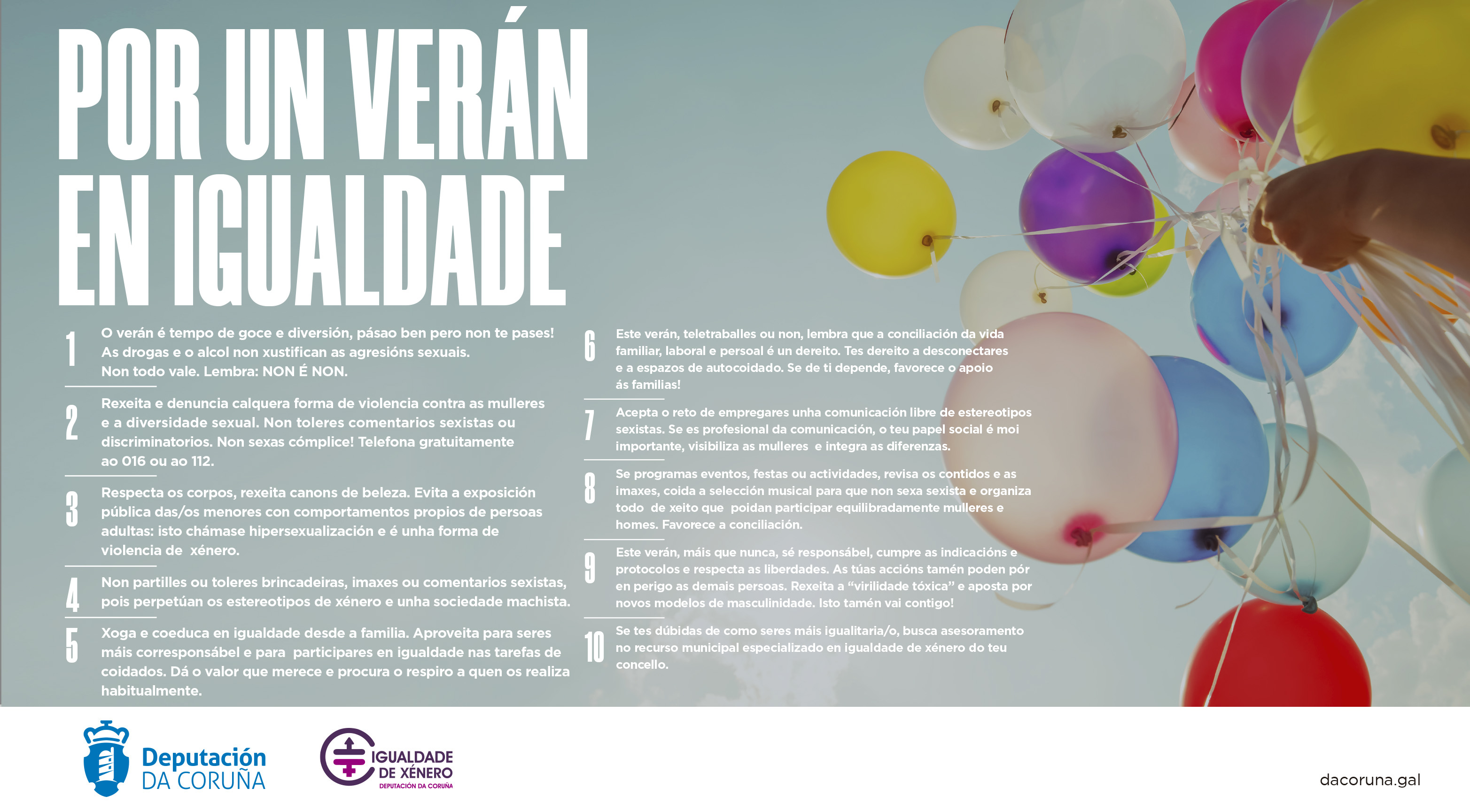Desde Igualdade da Deputación da Coruña ponse en marcha no marco do seu Plan de Igualdade 2018/2023 (www.compartimosplan.com) unha campaña para promover unhas festas en igualdade, este proxecto comezou no Nadal de 2019, continuo no Entroido 2020 e finaliza co Decálogo por un verán en igualdade.