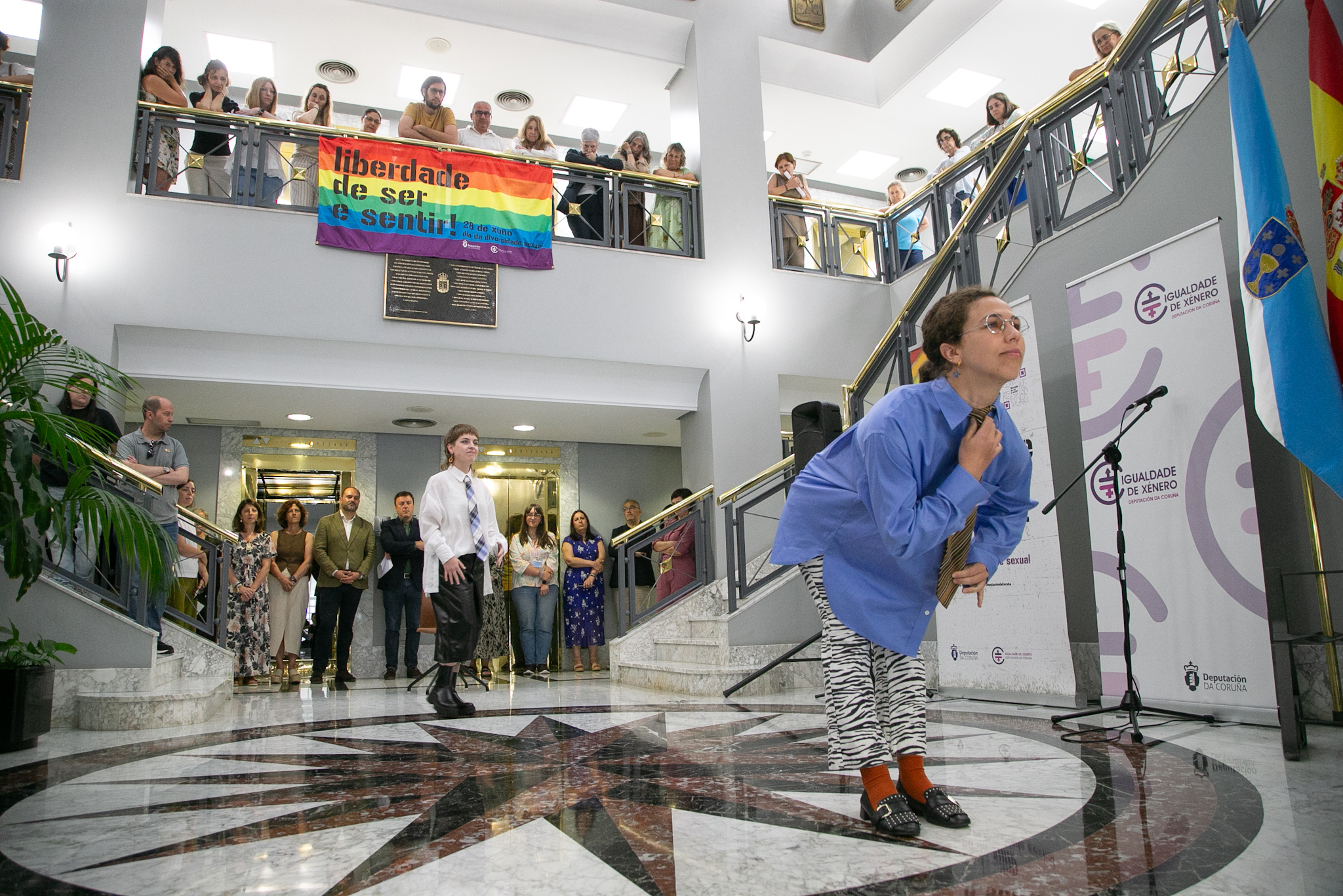O Pazo Provincial da Deputación da Coruña acolleu esta mañá o acto institucional de conmemoración do 28 de xuño, Día da Diversidade Sexual. Un acto que contou coas intervencións do presidente, Valentín González Formoso e da deputada de Igualdade e Dereitos Civís, Soledad Agra; unha lectura colectiva por parte de representantes dos diferentes grupos políticos, e unha performance do colectivo D'ELAS, e que forma parte da campaña anual 'Liberdade de Ser e de Sentir' destinada aos 93 concellos da provincia que inclúe palestras, representacións teatrais, materiais informativos, instalación de puntos LGBT e merchandising. Ademais, durante o pleno provincial de hoxe realizouse unha declaración insitucional.